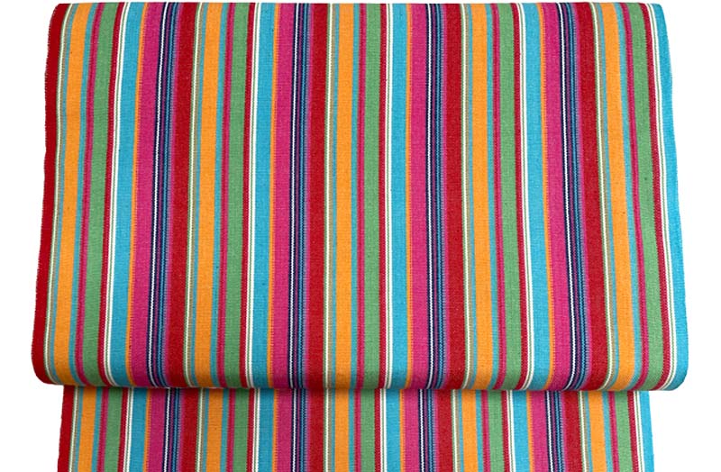 Deck Chair Canvas with pink, green, yellow, turquoise and deep red stripes divided with narrower blue and white stripes.