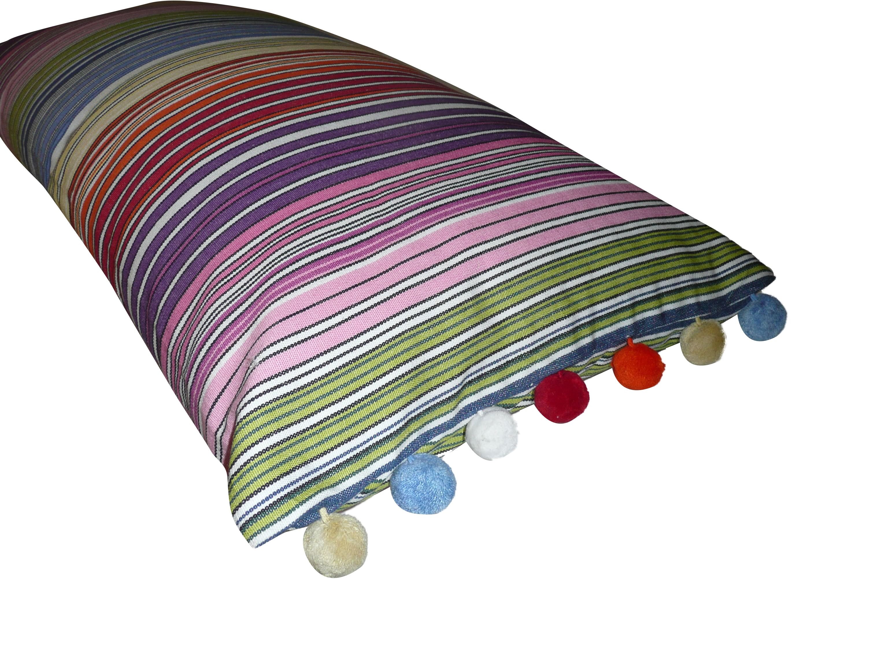 Pretty striped oblong cushions trimmed at both ends with coordinating pompom bobble fringe for hammock, sofas, chairs, beds.