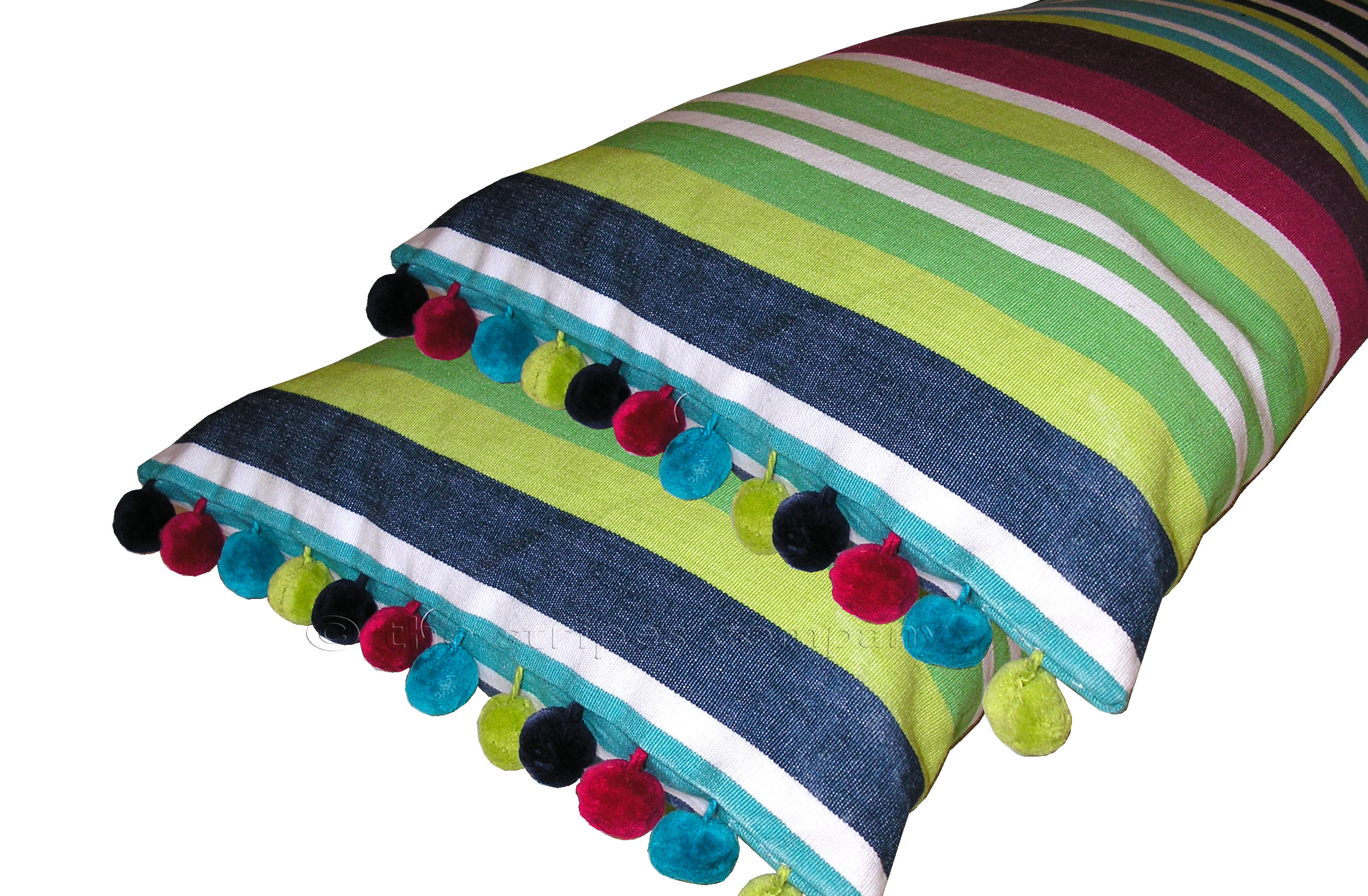 Pretty striped oblong cushions trimmed at both ends with coordinating pompom bobble fringe for hammock, sofas, chairs, beds.