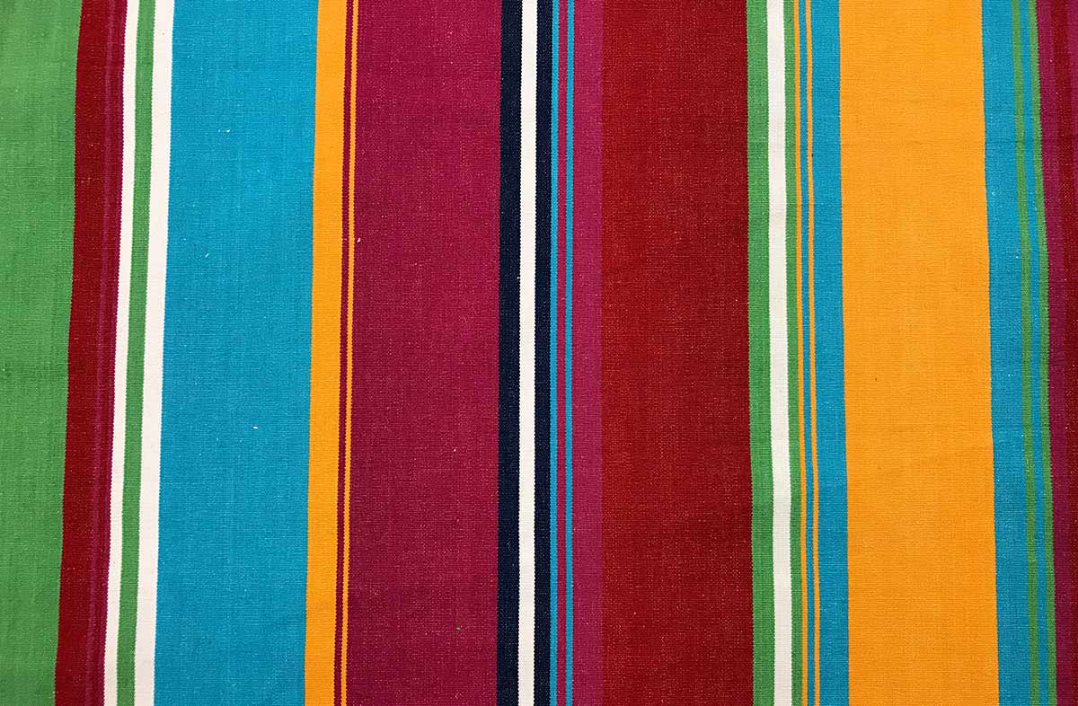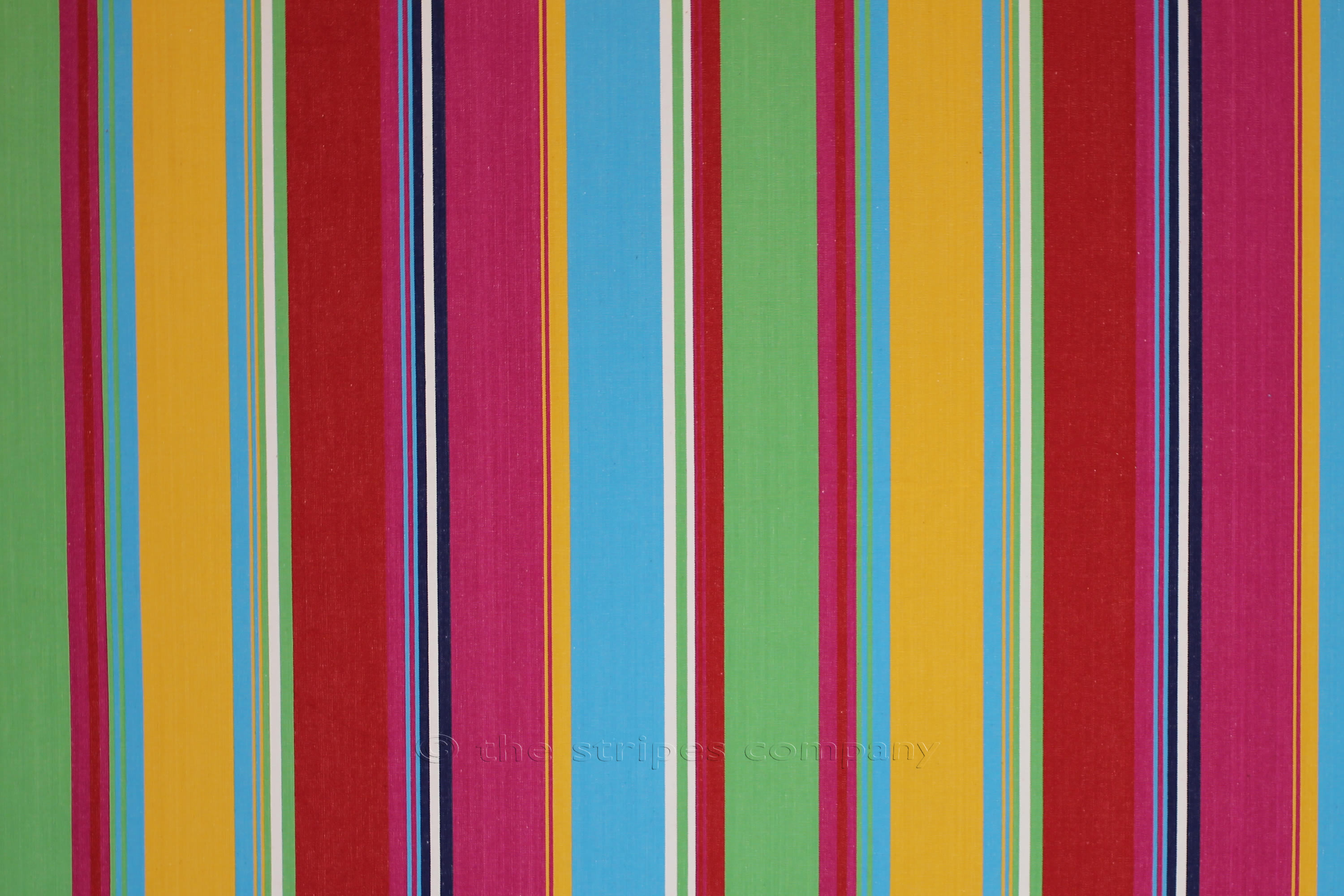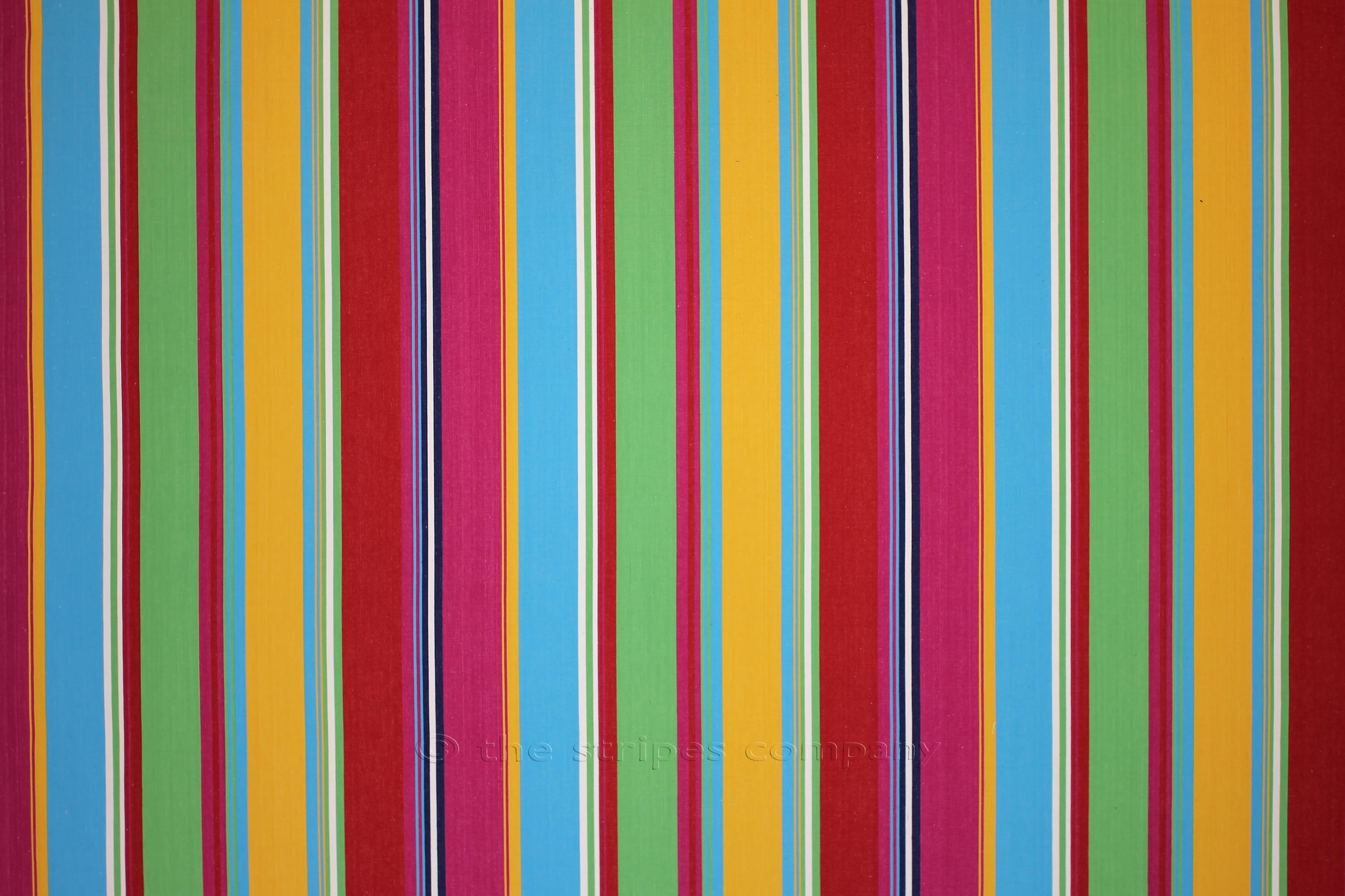 This bright striped material has wide stripes of pink, green, yellow, turquoise and deep red stripes divided with narrower blue and white stripes.