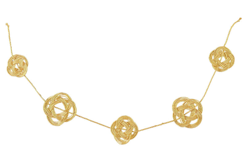 The length is one metre long with five love knots, large and small, threaded through with gold rope which may be tied at either end and like bunting, two or more garlands may be tied together for more impact.