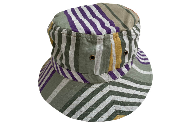 Our Exclusive Bestselling Bucket Hats in muted stripes of sage green, purple, mustard, rust and off white stripes.