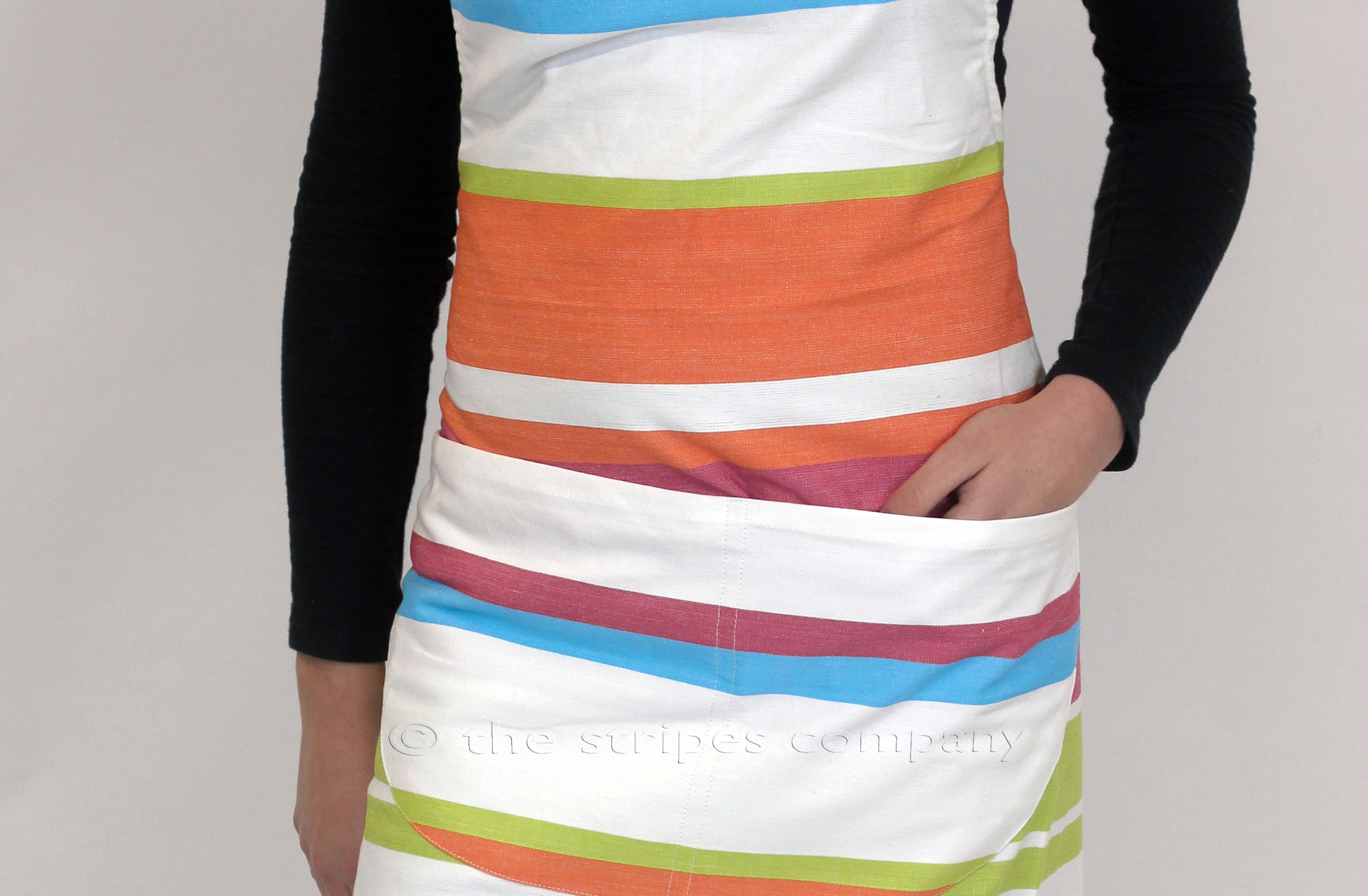 Striped cotton apron in Croquet stripe with Apple green, peachy orange, pink, turquoise and fresh white make up this clean looking yet bold wide stripe.