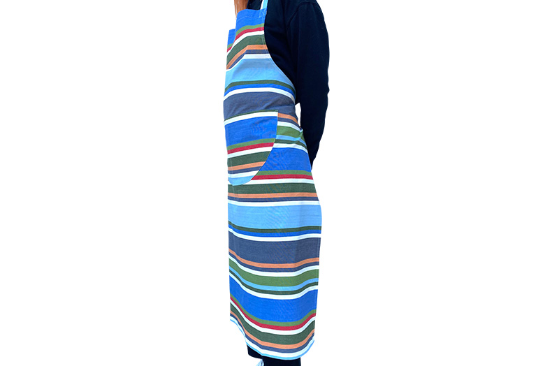 These long striped cotton aprons have stripes of pale blue, royal blue, denim blue and green, interspersed with thinner stripes of white, red and gold, together with with two generous front pockets, one size fits all, with wrap around ties.