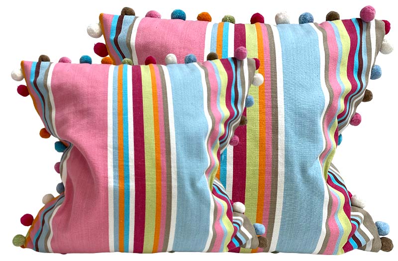 Ready Made Stripe Cushion Covers with pompoms in Cricket Pink Stripe - soft pastel shades of wide pink, taupe, blue, brown, mushroom, baby pink, light blue, magenta, white and lime green stripes.
