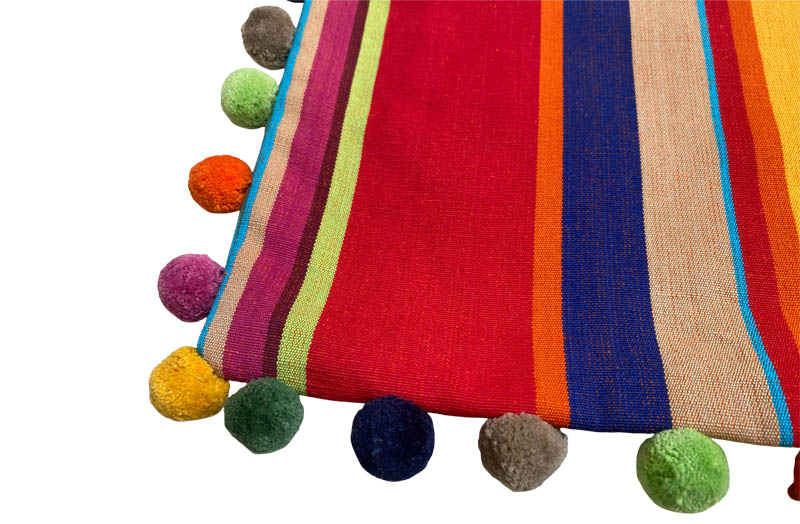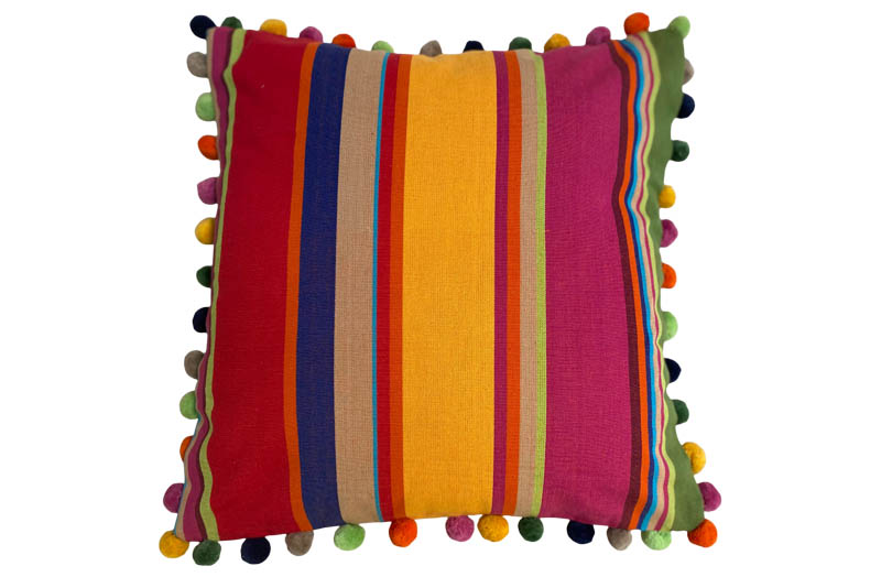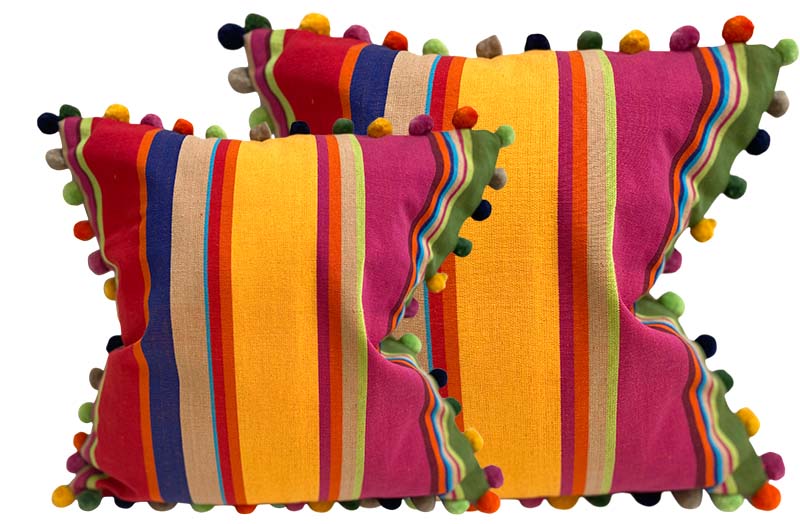 Our Ready Made Stripe Cushion Covers in bright stripes of pink, red, green, gold, coral, royal blue, toffee and lime, are edged with matching soft cotton pompom trim, which matches the colours of the stripes, adding an immediate pop of colour to your interior scheme.