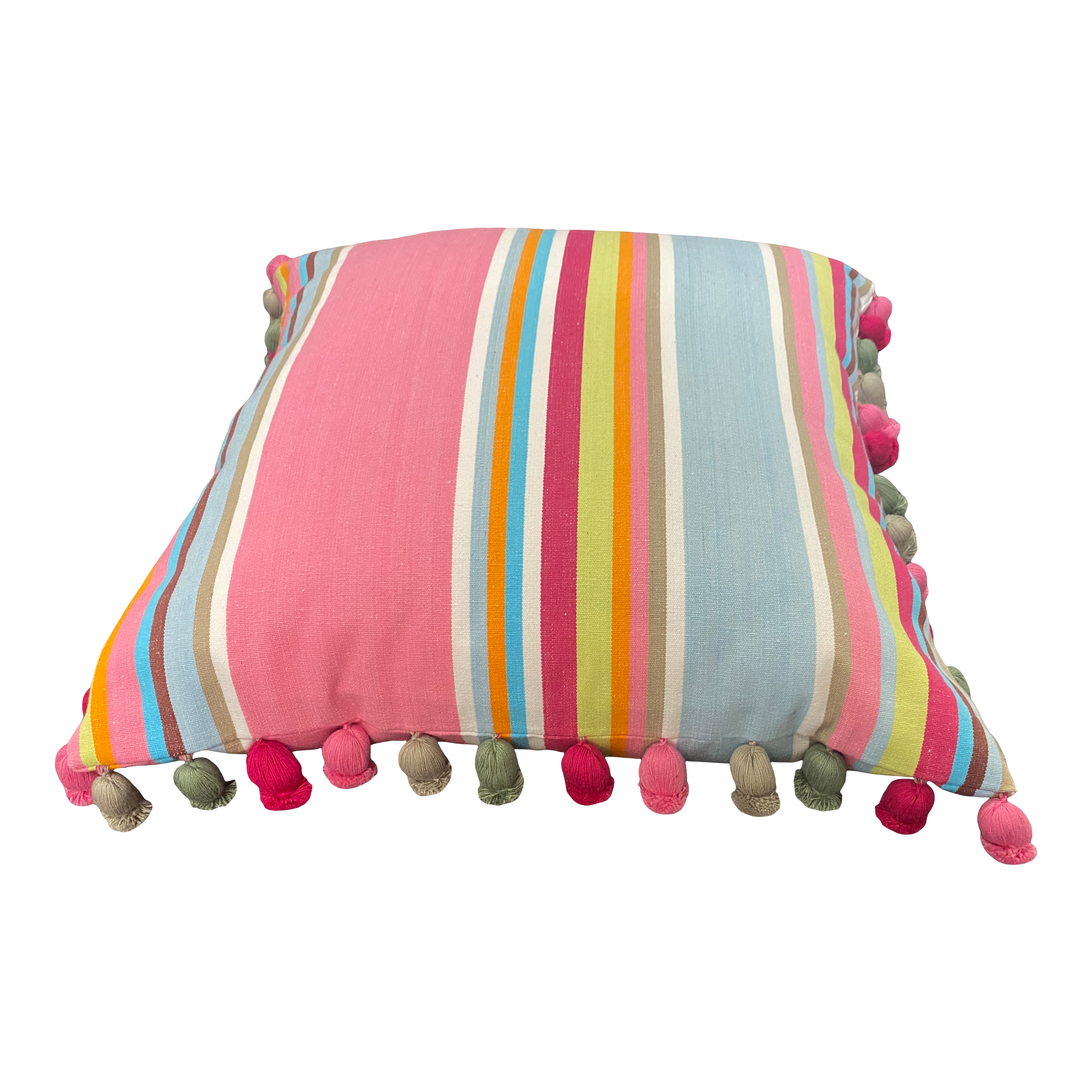 Made to Order Stripe Pompom Trimmed Cushions - individually made in our squash Interior Striped Fabric. Squash has soft pretty stripes of baby pink, taupe and light blue with thinner mushroom, white, lime green and magenta stripes.