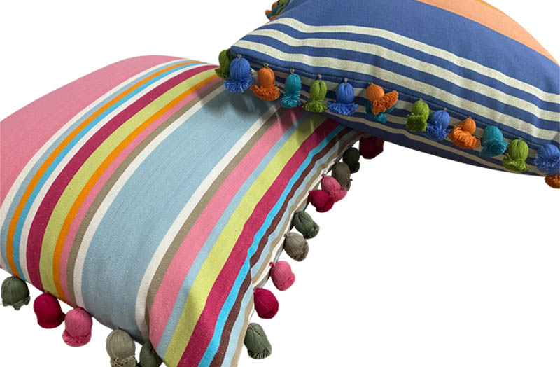 Bespoke made striped pompom cushions - need a different size not available above? use the form on this page bespoke striped pompom cushions to enquire