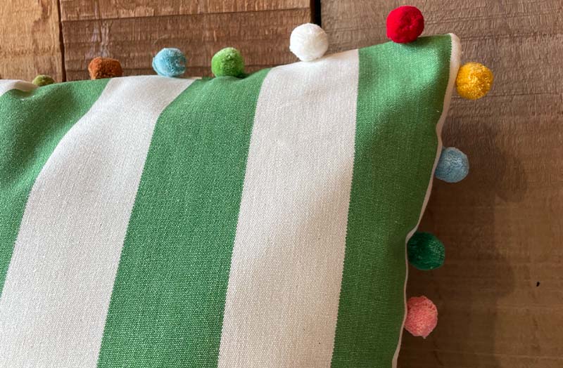 Made to Order Stripe Pompom Trimmed Cushions - individually made in any of our green and white Interior Striped Fabric.
