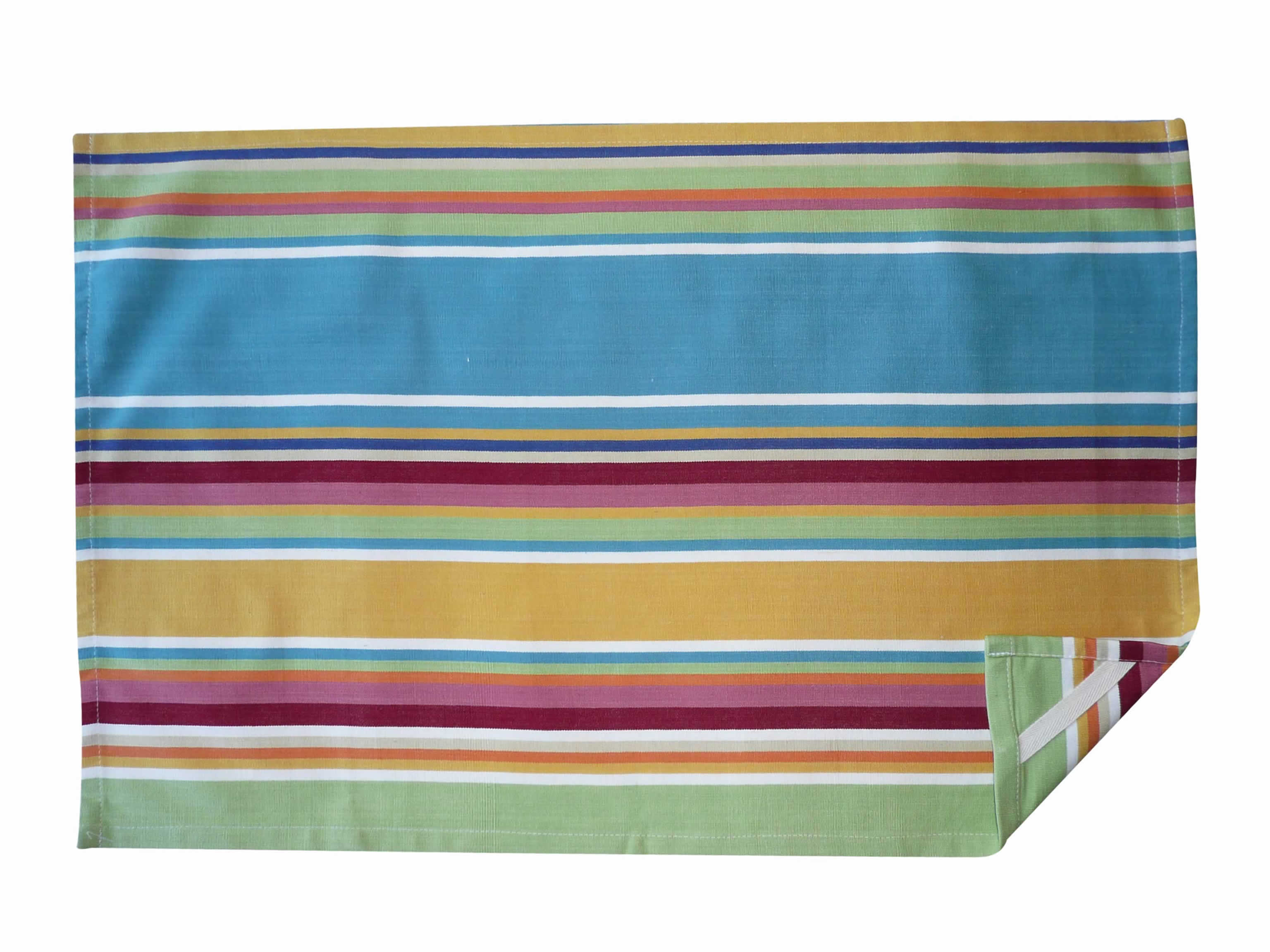 Cotton tea towel in wide yellow, pale green & sky blue stripes, with thin orange, red, pink and white stripes.