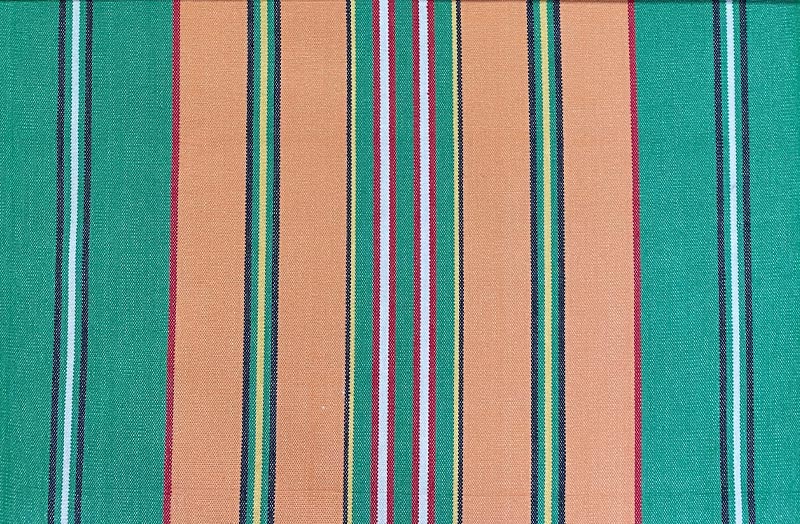 Vintage Green Deckchair Fabric with wide Terracotta bands and thin stripes of Green, Red, White, Yellow and Black for Deckchairs and Directors Chairs.